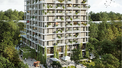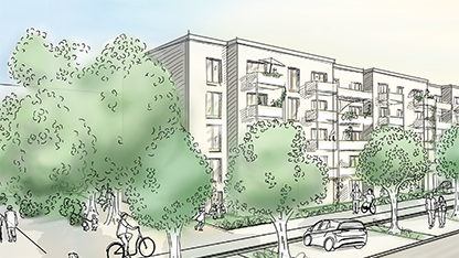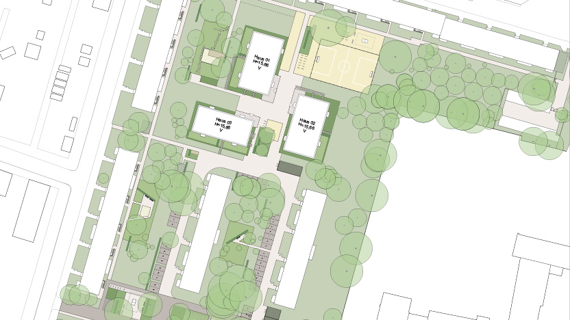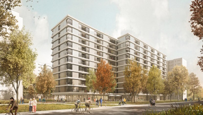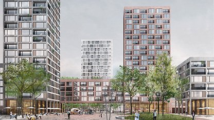 Im Rosenfelder Ring bilden zwei Gebäudekörper und ein neuer Quartiersplatz ein architektonisch ansprechendes Ensemble anstelle einer Garagensiedlung. Der klein gewachsene Kiez am S-Bahnhof Friedrichsfelde-Ost wird durch zwei 8-geschossige Gebäude ergänzt - im Vorbau des vorderen Gebäudes entstehen 23 Maisonnettewohnungen. Ein schöner innenliegender Garten, der spektakuläre Hauseingang, durch dessen Vordach ein Baum wachsen wird sowie die hohen Ausstattungsstandards der HOWOGE runden die architektonische Qualität dieses Wohnungsneubaus ab.