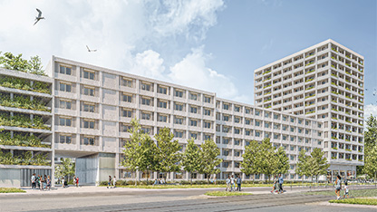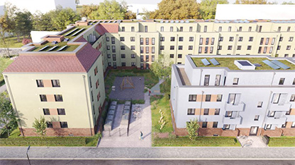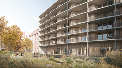 Das Gebäude am Hellersdorfer Theaterplatz mit insgesamt 167 Mietwohnungen entsteht als so genanntes „Nur-Strom-Haus“ und einer Energieversorgung mittels Luft-Wasser-Wärme-Pumpe sowie einer Photovoltaikanlage. Bei dem neuen Wohnhaus handelt es sich um den Ankauf einer Projektentwicklung. Die Errichtung in modularer Bauweise steht nicht nur für einen effizienten Bauablauf, sondern garantiert gleichbleibende hohe Qualitäten von Gebäude und Wohnungen – und damit auch beim Wohnkomfort für die Bewohner:innen.