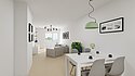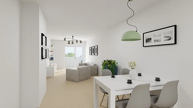 Hier entstehen unter anderem moderne 2-Zimmer-Apartments, die durch ihre klare Struktur und kompakte Gestaltung ideal auf die Bedürfnisse von Singles oder Paaren zugeschnitten sind. Auf einer Fläche von 62 Quadratmetern ist der Wohnraum effizient organisiert. Die großzügigen Wohnbereiche und eine offene Küchenzeile bieten viel Platz zum Wohnen und für Abstellflächen. Große Fenster mit Zugang zum Balkon sorgen für viel Tageslicht, während der Balkon zusätzlichen Freiraum schafft.