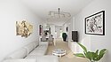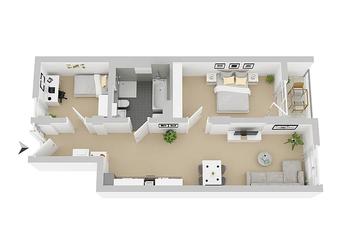 Hier entstehen moderne 3-Zimmer-Apartments, die durch ihre klare Struktur ideal auf kleine Familien zugeschnitten sind. Auf einer Fläche von rund 70 bis 83 Quadratmetern ist der Wohnraum effizient organisiert: Der offene Wohn- und Essbereich mit moderner Küchenzeile bietet viel Platz zum Wohnen und Verweilen. Das Badezimmer verfügt über eine Badewanne sowie eine separate Dusche, ideal für Flexibilität im Alltag. Das geräumige Schlafzimmer und das Kinderzimmer sorgen für zusätzlichen Komfort. Große Fenster mit Zugang zum Balkon lassen viel Tageslicht herein und schaffen eine angenehme Wohnatmosphäre.