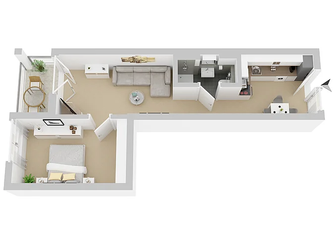 Hier entstehen unter anderem moderne 2-Zimmer-Apartments, die durch ihre klare Struktur und kompakte Gestaltung ideal auf die Bedürfnisse von Singles oder Paaren zugeschnitten sind. Auf einer Fläche von rund 48 bis 63 Quadratmetern ist der Wohnraum effizient organisiert. Die großzügigen Wohnbereiche und eine offene Küchenzeile bieten viel Platz zum Wohnen und für Abstellflächen. Große Fenster mit Zugang zum Balkon sorgen für viel Tageslicht, während der Balkon zusätzlichen Freiraum schafft.