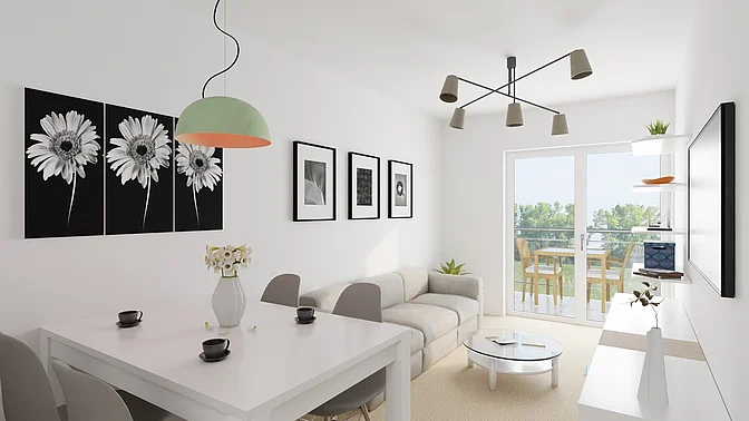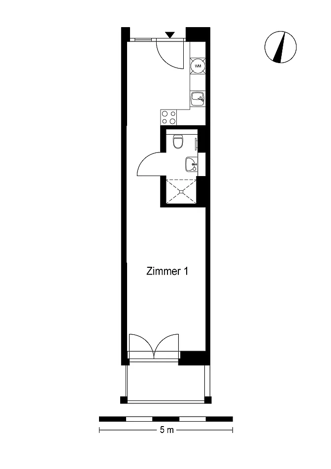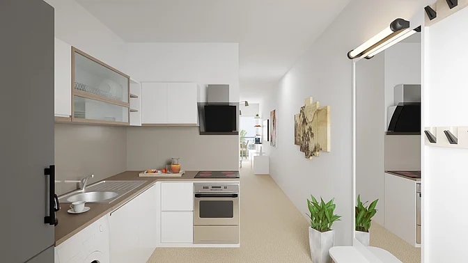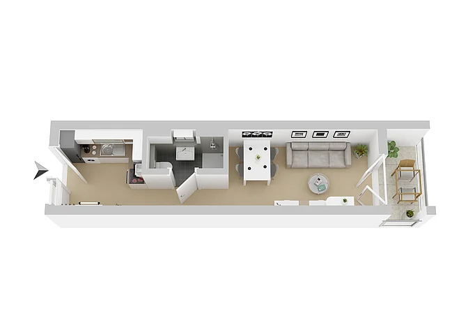 Hier entstehen unter anderem moderne 1-Zimmer-Wohnungen, die durch ihre klare Struktur und kompakte Gestaltung ideal auf die Bedürfnisse von Studierenden und Alleinstehenden zugeschnitten sind. Auf einer Fläche von rund 35 Quadratmetern ist der Wohnraum effizient organisiert: Der Eingangsbereich mit einer großzügigen Küchenzeile wird durch das Bad und den kleinen Flur geschickt vom Wohn- und Schlafbereich getrennt und schafft so eine angenehme Gliederung der Wohnung. Die große Fensterfront mit Zugang zum Balkon sorgt für viel Tageslicht, während der Balkon zusätzlichen Freiraum bietet.