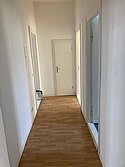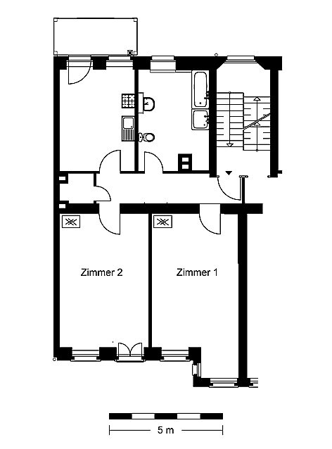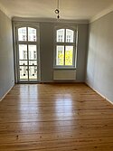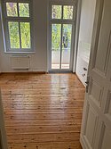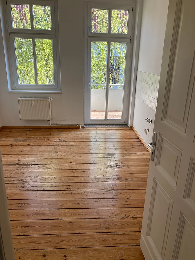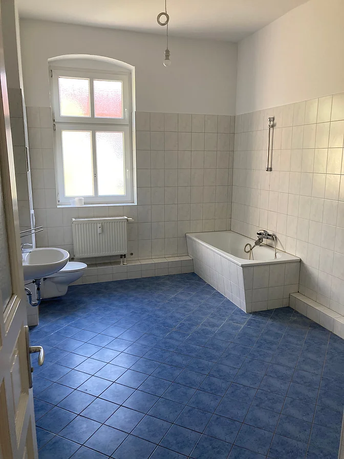 großes Bad mit gefliestem Wannenbad und Fenster, von der Küche Zugang zum hofseitigen Balkon, tw. abgezogene Dielung