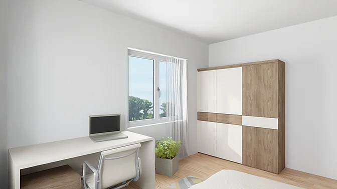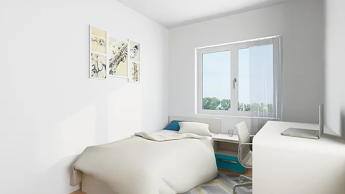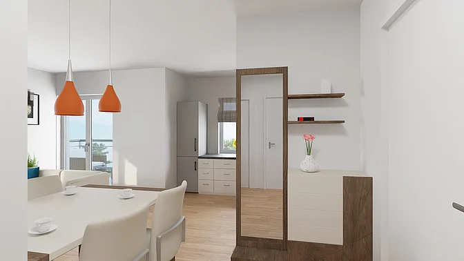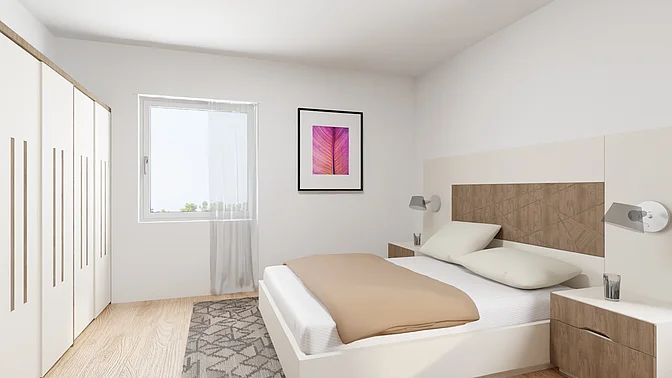 Die Wohnungen werden unmöbliert vermietet, die Visualisierungen sollen der Veranschaulichung dienen (Fenstergrößen und tatsächliche Ausstattung können abweichen).