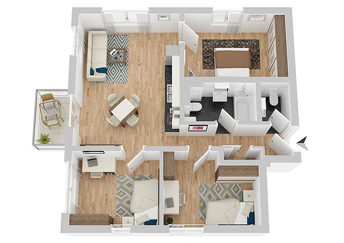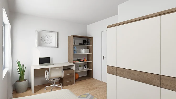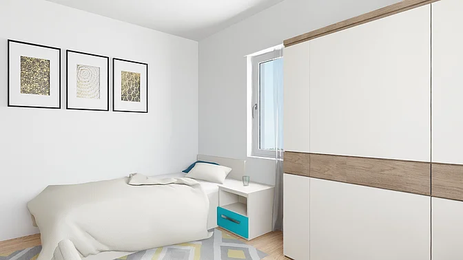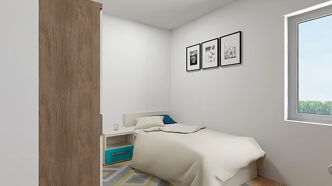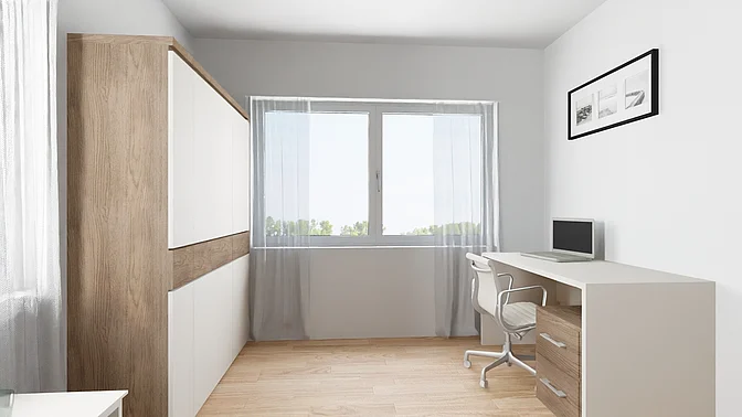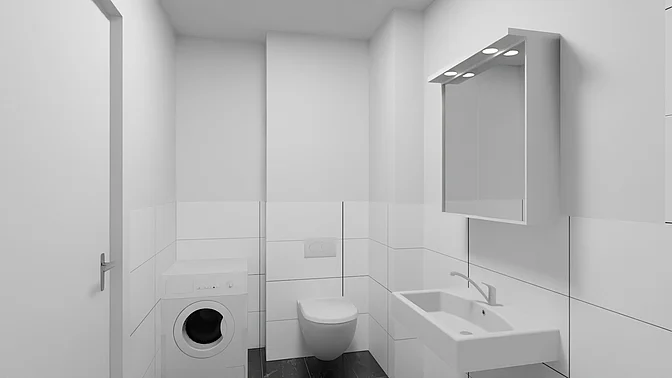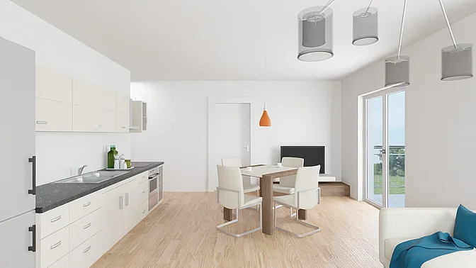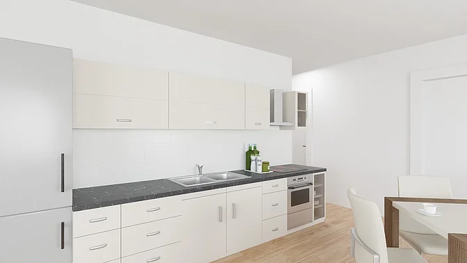 Die Wohnungen werden unmöbliert vermietet, die Visualisierungen sollen der Veranschaulichung dienen (Fenstergrößen und tatsächliche Ausstattung können abweichen).