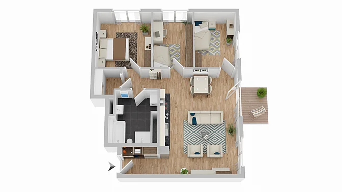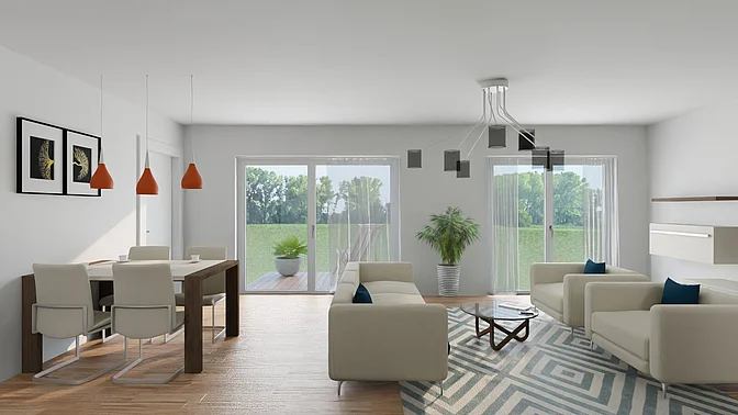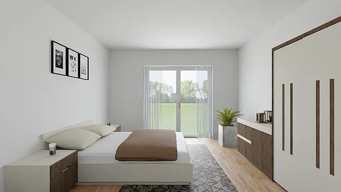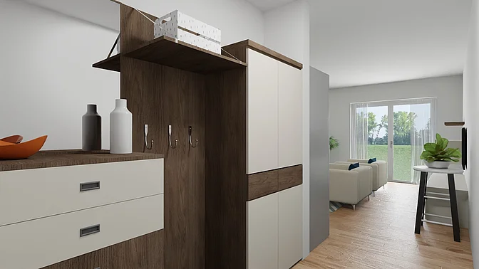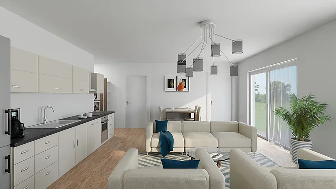 Bitte beachten Sie, dass es sich vorerst nur um eine Beispielwohnung handelt. Die weiteren, real verfügbaren Wohnungen können nach Besichtigung der Musterwohnung digital in der App eingesehen werden. Vor Ort können Sie sich in einer Musterwohnung einen Eindruck von der Ausstattung, der Qualität und der Beschaffenheit des gesamten Objektes verschaffen. In den Visualisierungen wird das Mobiliar exemplarisch dargestellt und gibt keinen Rückschluss auf die Ausstattung der Wohnungen.