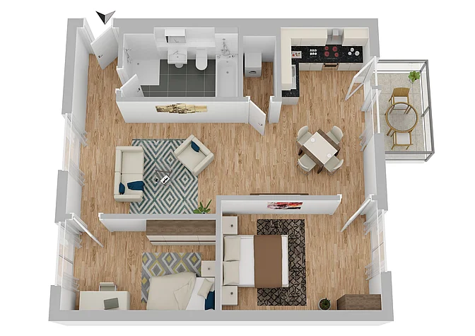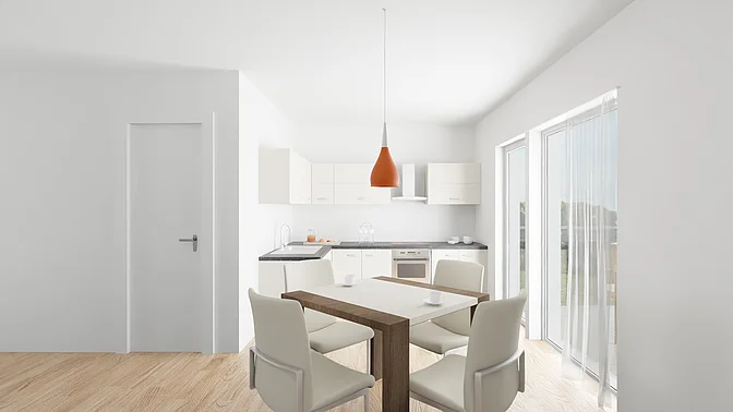 Bitte beachten Sie, dass es sich vorerst nur um eine Beispielwohnung handelt. Die weiteren, real verfügbaren Wohnungen können nach Besichtigung der Musterwohnung digital in der App eingesehen werden. Vor Ort können Sie sich in einer Musterwohnung einen Eindruck von der Ausstattung, der Qualität und der Beschaffenheit des gesamten Objektes verschaffen. In den Visualisierungen wird das Mobiliar exemplarisch dargestellt und gibt keinen Rückschluss auf die Ausstattung der Wohnungen.