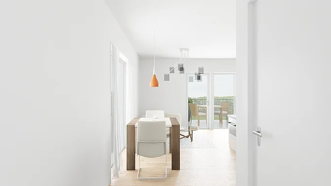 Bitte beachten Sie, dass es sich vorerst nur um eine Beispielwohnung handelt. Die weiteren, real verfügbaren Wohnungen können nach Besichtigung der Musterwohnung digital in der App eingesehen werden. Vor Ort können Sie sich in einer Musterwohnung einen Eindruck von der Ausstattung, der Qualität und der Beschaffenheit des gesamten Objektes verschaffen. In den Visualisierungen wird das Mobiliar exemplarisch dargestellt und gibt keinen Rückschluss auf die Ausstattung der Wohnungen.