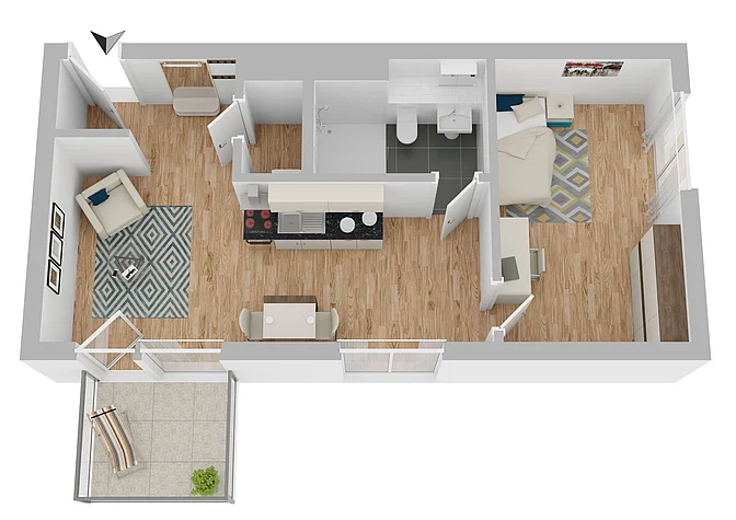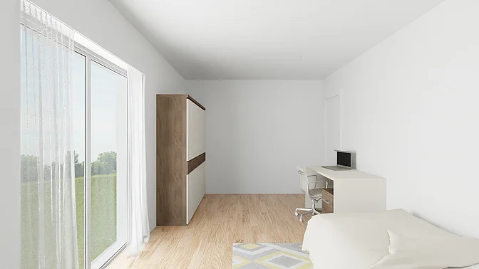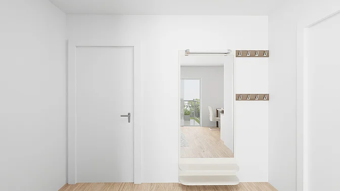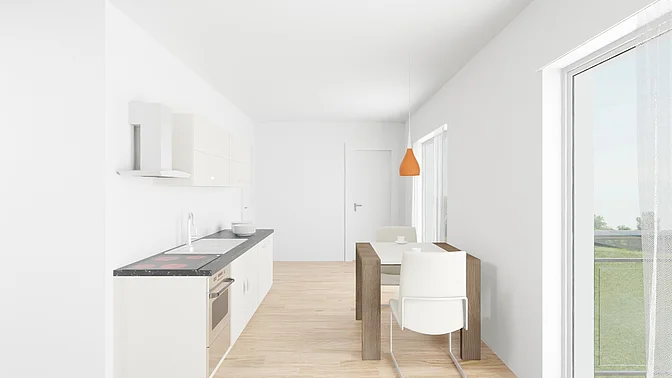 Bitte beachten Sie, dass es sich vorerst nur um eine Beispielwohnung handelt. Die weiteren, real verfügbaren Wohnungen können nach Besichtigung der Musterwohnung digital in der App eingesehen werden. Vor Ort können Sie sich in einer Musterwohnung einen Eindruck von der Ausstattung, der Qualität und der Beschaffenheit des gesamten Objektes verschaffen. In den Visualisierungen wird das Mobiliar exemplarisch dargestellt und gibt keinen Rückschluss auf die Ausstattung der Wohnungen.