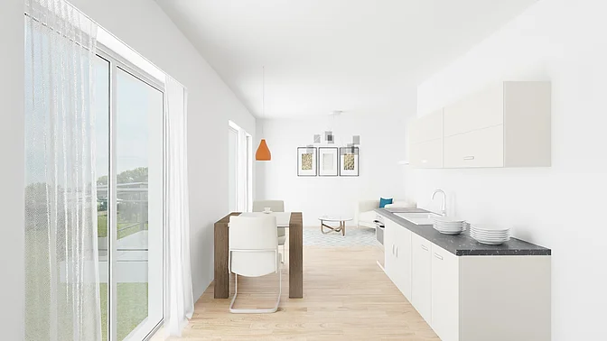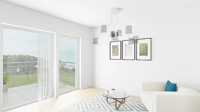 Bitte beachten Sie, dass es sich vorerst nur um eine Beispielwohnung handelt. Die weiteren, real verfügbaren Wohnungen können nach Besichtigung der Musterwohnung digital in der App eingesehen werden. Vor Ort können Sie sich in einer Musterwohnung einen Eindruck von der Ausstattung, der Qualität und der Beschaffenheit des gesamten Objektes verschaffen. In den Visualisierungen wird das Mobiliar exemplarisch dargestellt und gibt keinen Rückschluss auf die Ausstattung der Wohnungen.