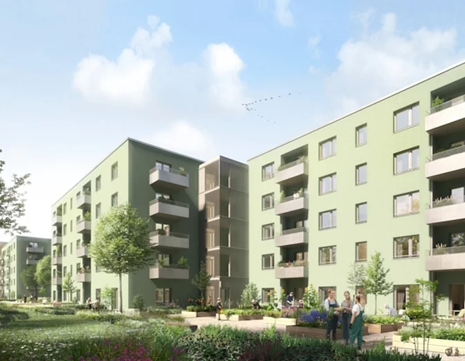 Neben mehrgeschossigen Wohnhäusern prägen Kleingartenanlagen und viel Grün das Stadtbild.