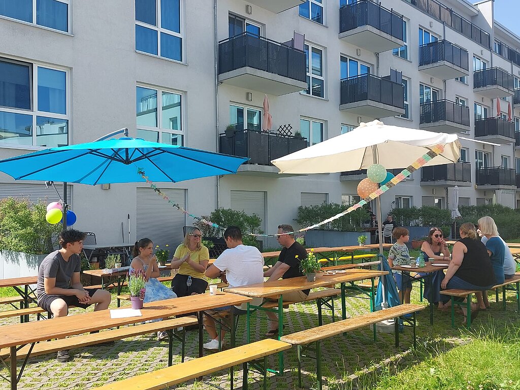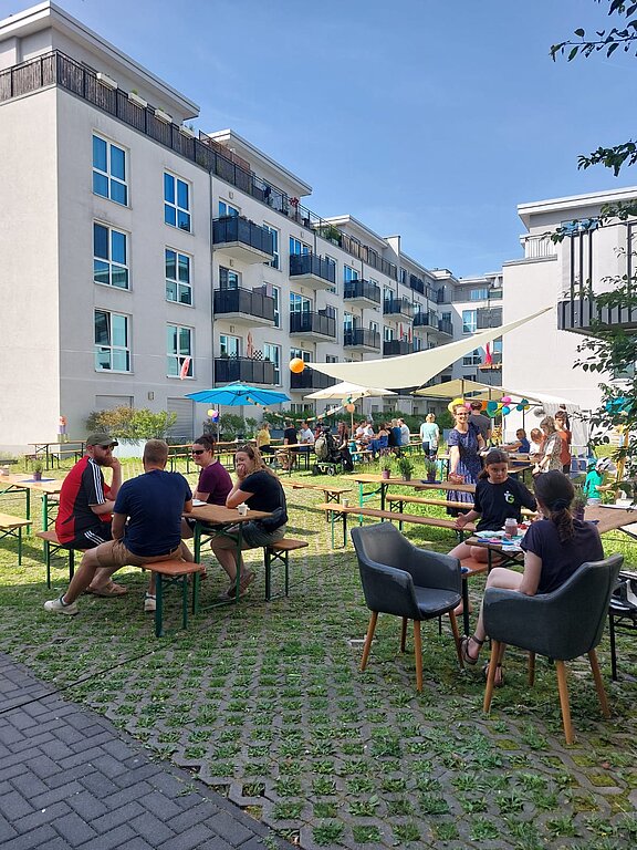 Wofür kann man die HOWOGE-Nachbarschaftsbox eigentlich einsetzen? Ein tolles Beispiel hierfür ist die Nachbarschaftsaktion von Theresa Uhlig. Mit dem Aufruf an ihre Nachbarschaft: „Lasst uns gemeinsam den Sommer feiern und zusammen einen tollen Nachmittag auf unserem Innenhof verbringen!“ organisierte die Mieterin mit Unterstützung der HOWOGE ein Sommerfest von Nachbarn für Nachbarn in der Reichenberger Straße. Neben der Organisation von Musik, Spielen, einer Hüpfburg und Sitzmöglichkeiten mobilisierte sie ihre Nachbarn zum Mitmachen: alle Nachbar:innen wurden eingeladen, selbstgemachte Kuchen, Salate etc. mitzubringen und aussortierte Kleidung, Spielzeug usw. zum Tausch oder für wenig Geld auf dem kleinen Hof-Flohmarkt anzubieten.
